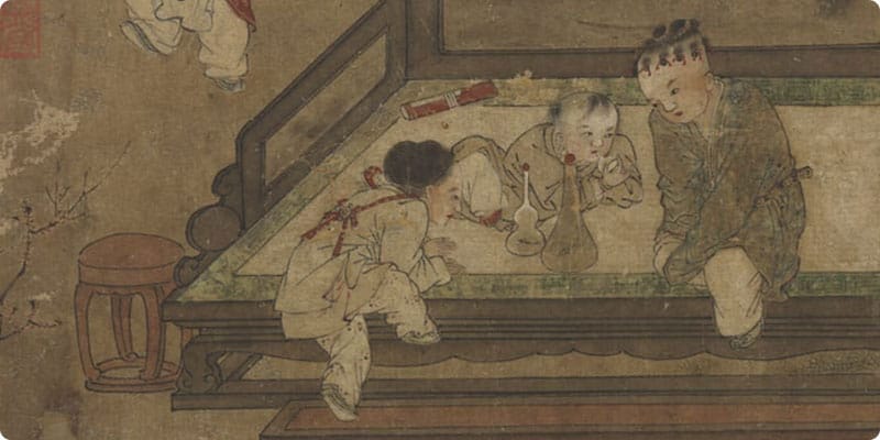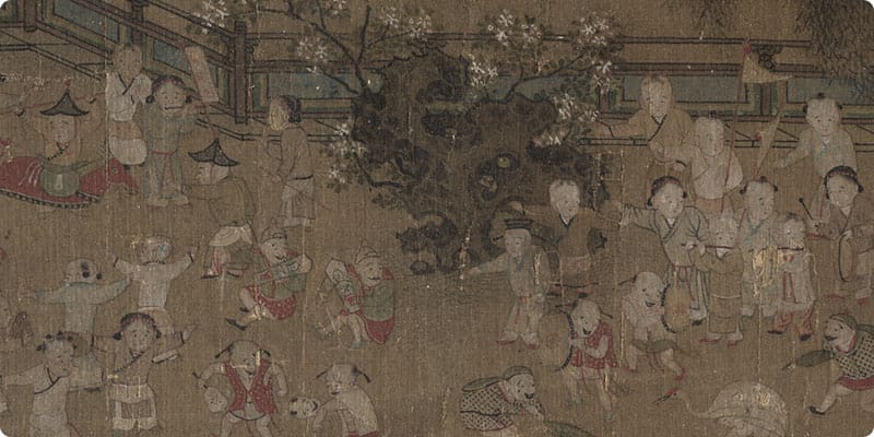 Su Han-chen was a native of Kai-feng, Honan, who specialized in painting Buddhist and Taoist figures. During the Hsuan-ho era (1119-1125) under Emperor Hui-tsung of the Northern Song, he was a Painter-in-Attendance at the imperial academy. After the court moved south, Su resumed his position there, and, in the early Lung-hsing era (1163-1164) of Emperor Hsiao-tsung, he was praised for his Buddhist paintings, earning the title "Gentleman of Trust." In figure painting, the representation of children is recognized as one of the most difficult, especially in achieving that elusive quality of naivete. Su Han-chen was a master of observation and description who knew that children at play are in a state of natural ease. His ability to capture the spirit and appearance of such children made him the most renowned painter in this genre.
