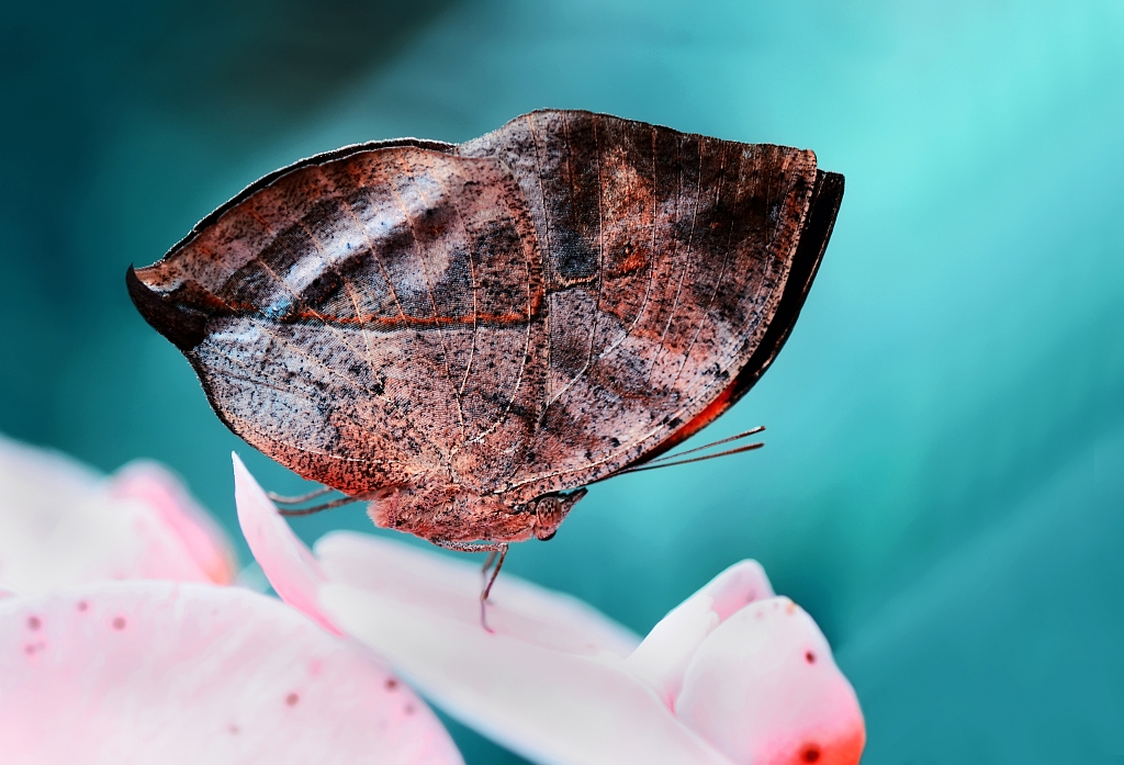 To trick birds, the orange oakleaf puts on a masquerade — when it stops at a place, it closes its wings to hide the conspicuous side with bright colors of orange and blue. Veins and irregular patterns on a brown base are revealed instead, perfectly mimicking a dry leaf, and escaping an attack from above.