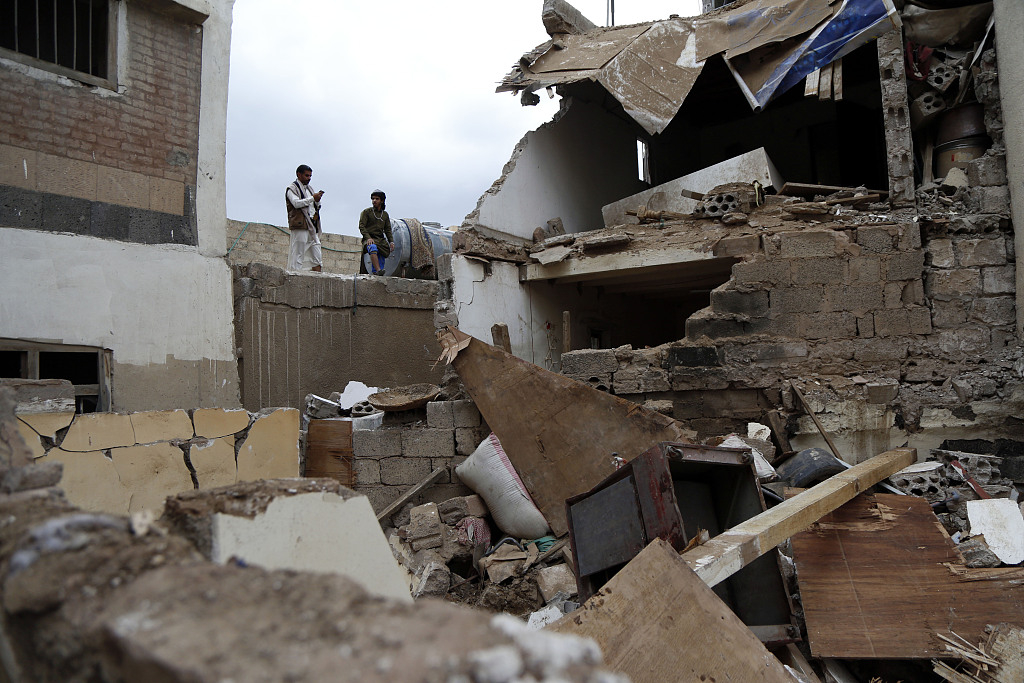 Two men inspect a house in Sanaa a day after it was hit by airstrikes carried out by the Saudi-led coalition, Yemen, May 17, 2019. /VCG Photo