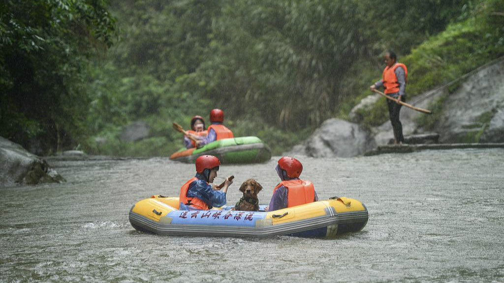 A special "dog rafting" competition was held in Yueyang City, central China's Hunan Province. Dogs sat in the raft with their owners to navigate the 8-kilometer waterway. /VCG Photo