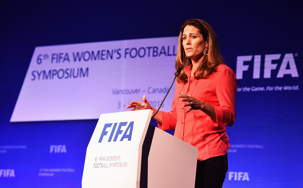 Julie Foudy addresses the delegates during the 6th FIFA Women's Football Symposium in Vancouver, Canada, July 5, 2015. /VCG Photo