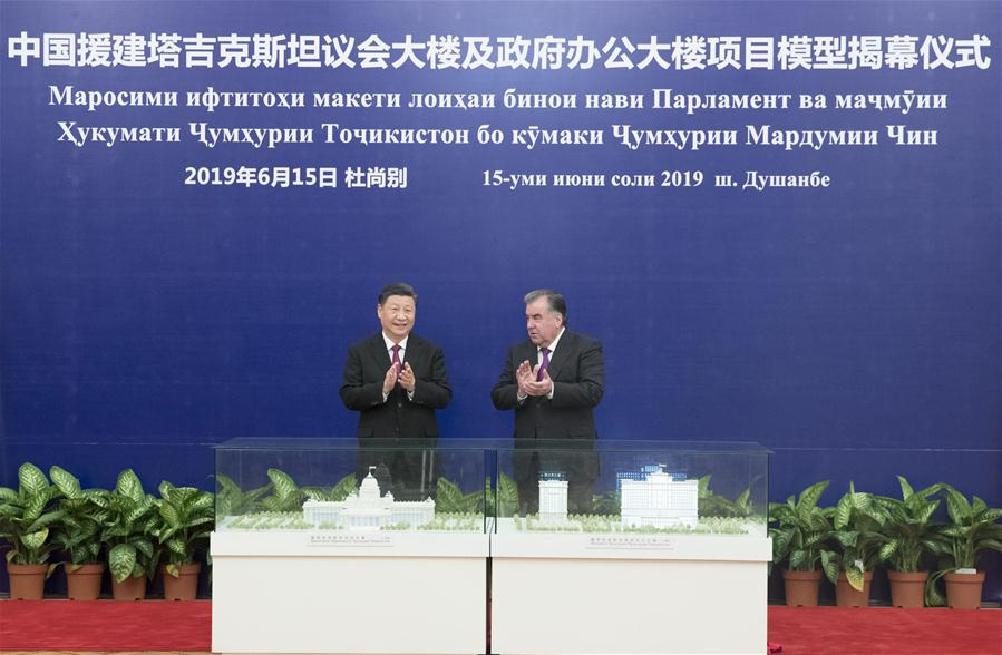 Chinese President Xi Jinping (L) and his Tajik counterpart Emomali Rahmon attend a ceremony to unveil the construction models of the China-assisted parliament building and government office building after their talks in Dushanbe, Tajikistan, June 15, 2019. /Xinhua Photo