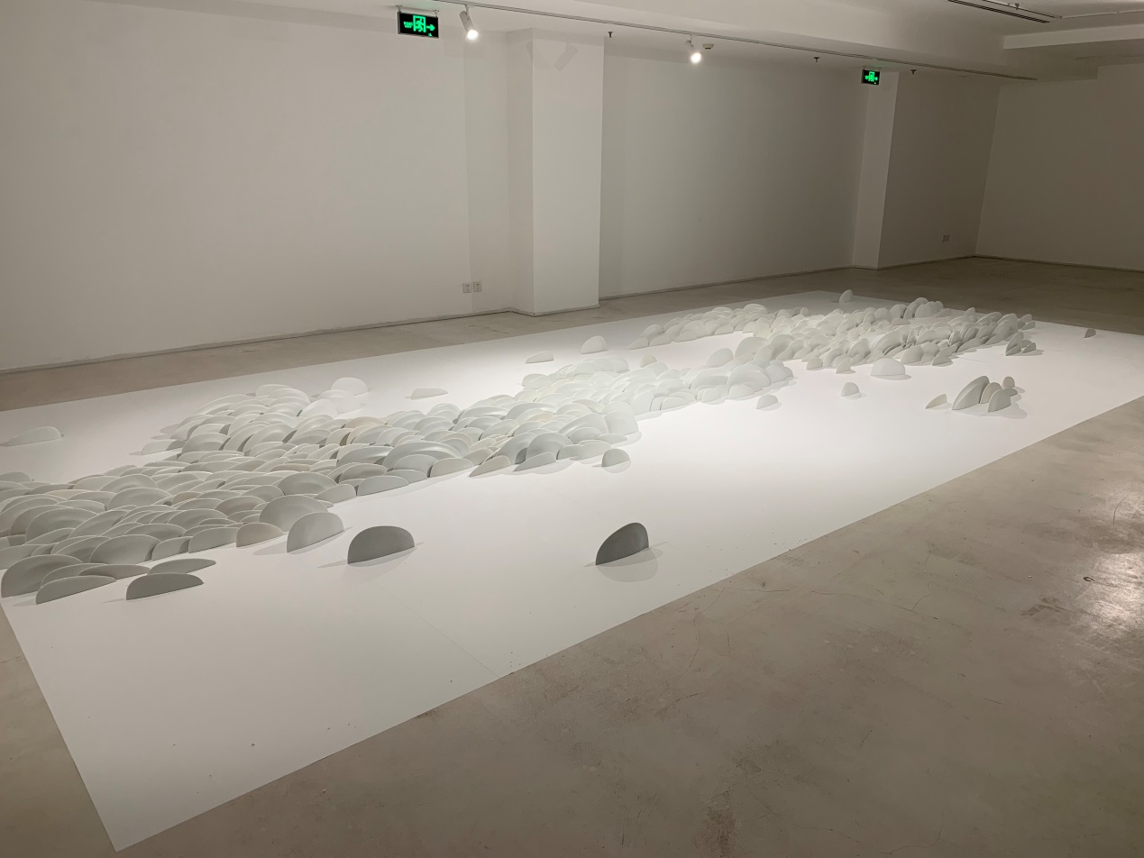 The exhibition also presents another ceramic work by Chinese artist Zhang Ming, who uses hundreds of white ceramic chips to portray a traditional Chinese ink wash painting.