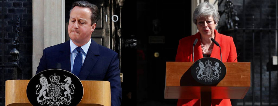 A combination of photos showing former PM David Cameron announcing his resignation after a 2016 referendum to leave the EU and PM Theresa May announcing her resignation after failing to get a Brexit deal. /CGTN Photo