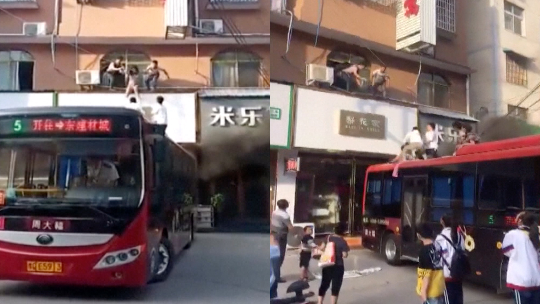 A bus driver helped residents trapped in a burning building in Zhumadian City, central China's Henan Province evacuate, by parking his vehicle next to the building and using it as an escape ladder.