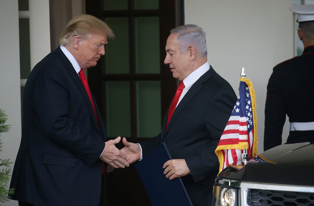 U.S. President Donald Trump (L) and Israel's Prime Minister Benjamin Netanyahu shake hands as Netanyahu departs the White House from the West Wing in Washington, U.S., March 25, 2019. /VCG Photo