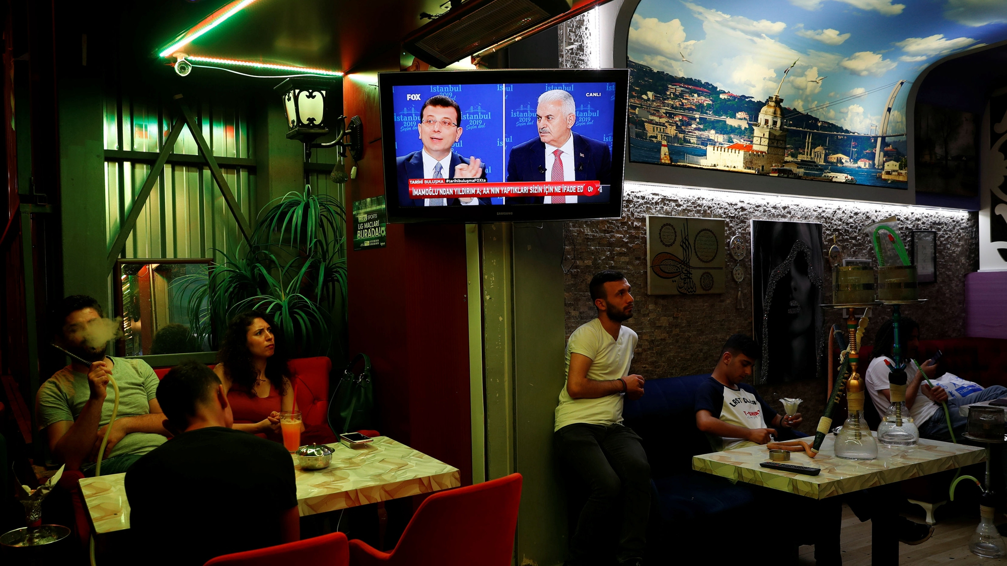 People watch a televised debate between Ekrem Imamoglu and Binali Yildirim at a cafe in central Istanbul, Turkey, June 16, 2019. /Reuters Photo