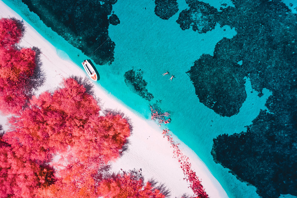These astonishing pictures capture the dream holiday islands of the Maldives by drone in a way that has never been seen before. Italian photographer Paolo Pettigiani uses a special camera to filter for infrared light, turning the palm trees bright red in contrast with the Maldives' famous crystal clear waters.