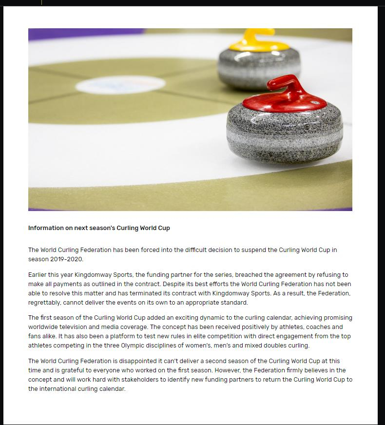 The World Curling Federation has been forced to suspend the 2019/20 Curling World Cup, according to the governing body's official website.