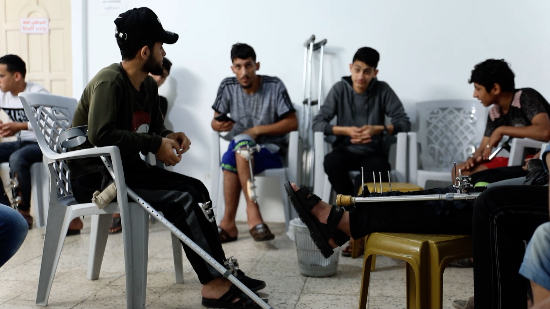 The medical waiting room is filled with injured young men with crutches resting by their sides and metal pins protruding from their legs.