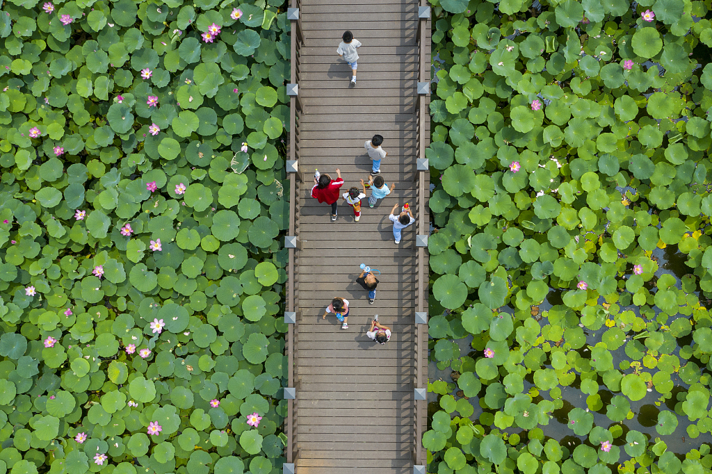 A lotus pond in Binzhou, eastern China's Shandong Province greets Friday visitors with pink and white blossoms decorating the lotus leaves. /VCG Photo