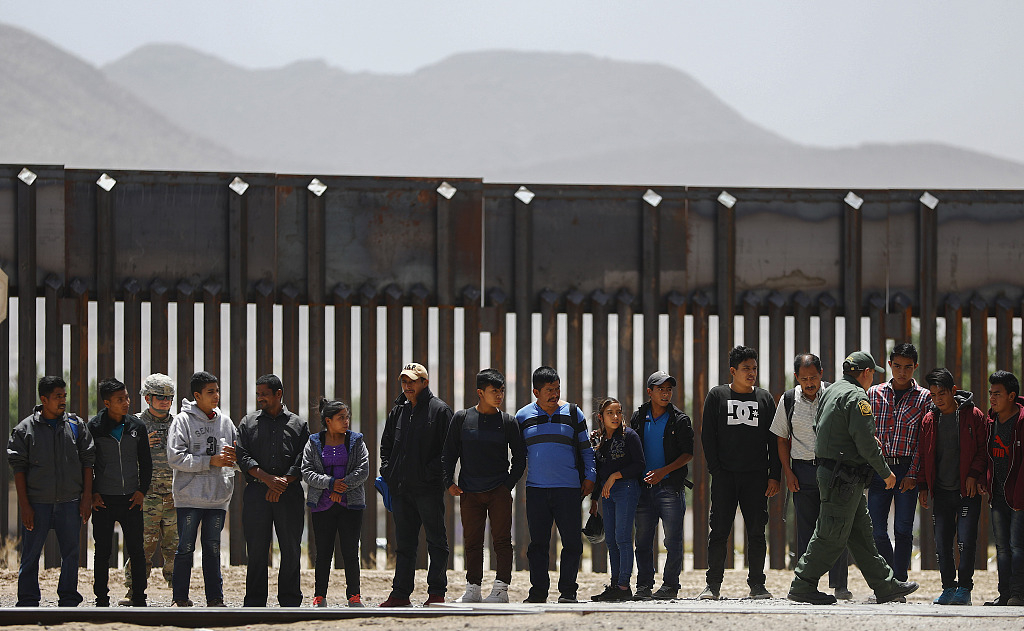A U.S. Border Patrol agent (right) walks past migrants being detained after crossing to the U.S. side of the U.S.-Mexico border barrier, May 17, 2019. /VCG Photo