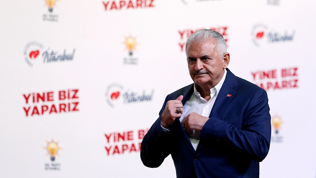 Binali Yildirim, defeated mayoral candidate of the ruling AK Party, leaves after talking to media at his party's headquarters in Istanbul, Turkey, June 23, 2019. /VCG Photo