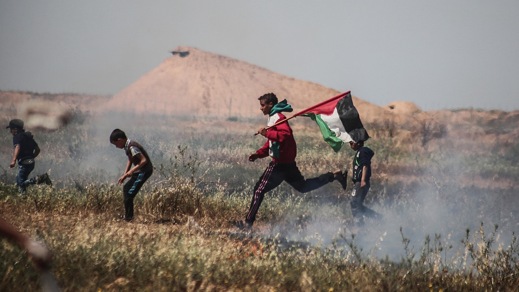 A Palestinian youth runs with a flag during clashes at the border fence between Israel and Gaza in southern Gaza Strip, May 15, 2019. /VCG Photo