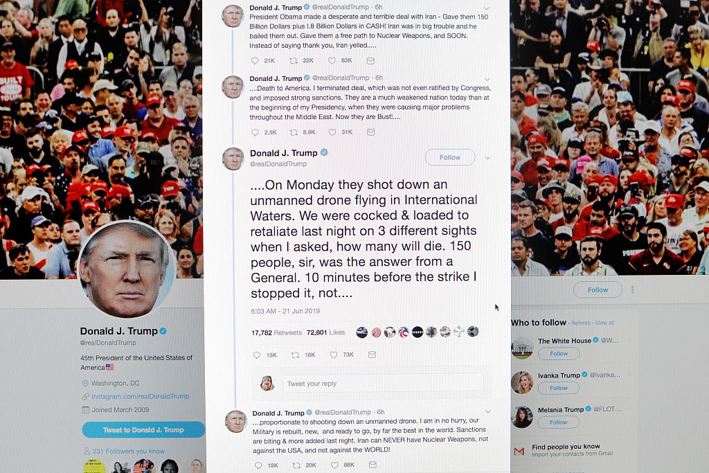 A series of tweets written by U.S. President Donald Trump regarding a retaliatory attack on Iran are displayed on a computer screen in New York, U.S., June 21, 2019. /VCG Photo