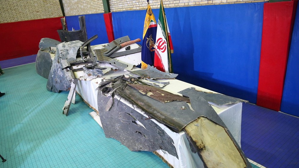 The purported wreckage of the American drone is seen displayed by the Islamic Revolution Guards Corps (IRGC) in Tehran, Iran June 21, 2019. /VCG Photo