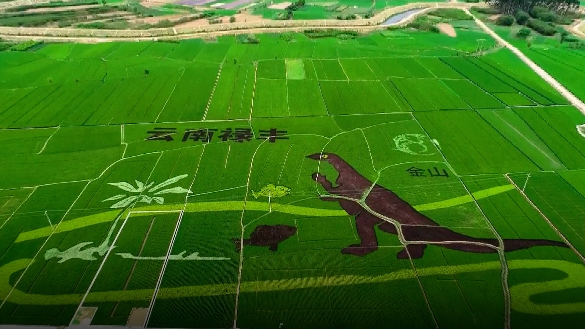A rice paddy painting featuring a giant dinosaur image in Lufeng County in southwest China's Yunnan Province. Many Jurassic dinosaurs have been discovered in the county. The rice landscape covers about 1.3 hectares. A dinosaur and coconut trees represent Lufeng in the Jurassic period. Fish stands for a rice-fish green ecological system and yellow ribbons symbolize rivers. The giant dinosaur image has led to an influx of visitors from across the country.