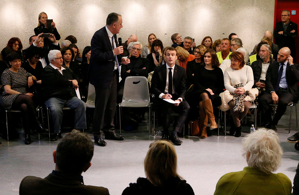 French President Emmanuel Macron (C) attends a meeting attended by local residents as part of the "Great National Debate" in Bourg-de-Peage near Valence, France, January 24, 2019. /VCG Photo