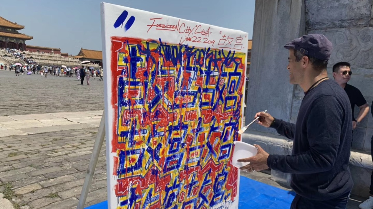 France-based artist JonOne paints at the Palace Museum, June 25 2019. /Photo courtesy of Zhongyu Power Culture Company