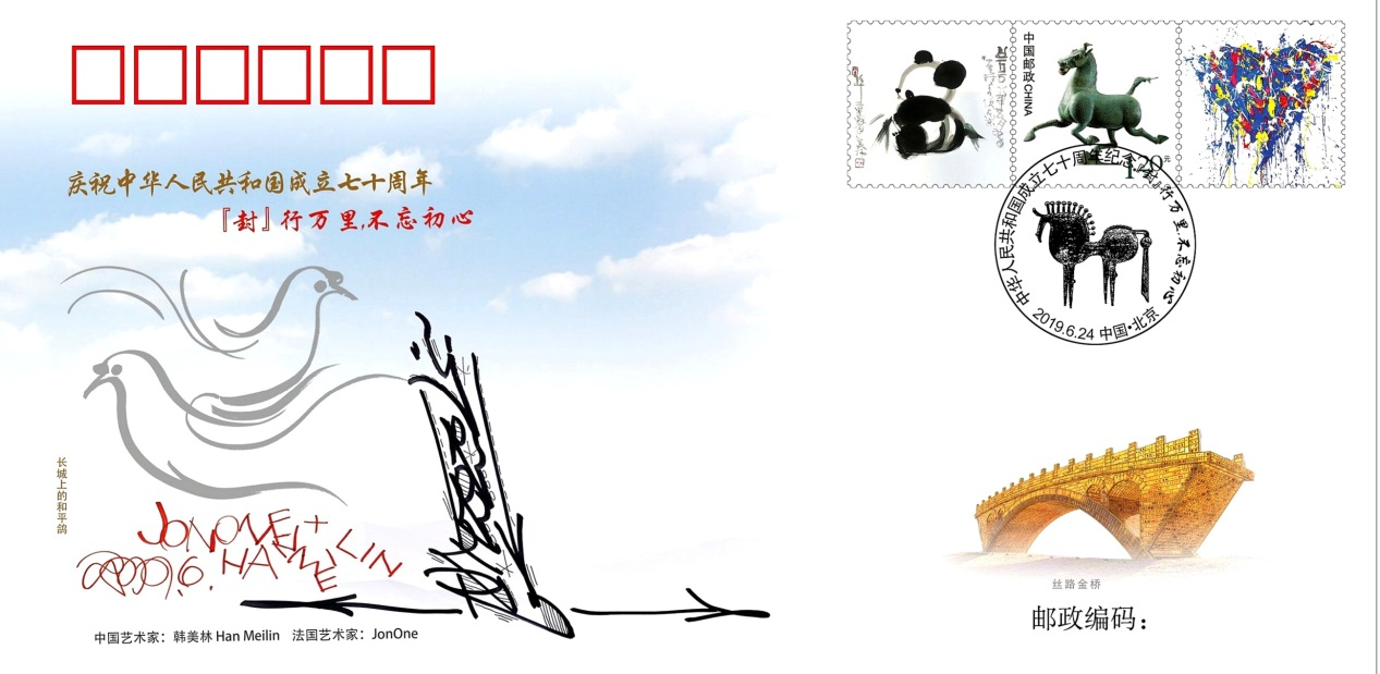 The pattern on the envelope was created three days before the event when the two artists met in Beijing. Han Meilin, the first Chinese artist, honored as one of UNESCO's Artists for Peace, and JonOne, known for his abstract expressionism in graffiti, created the image with seemingly different artistic styles.