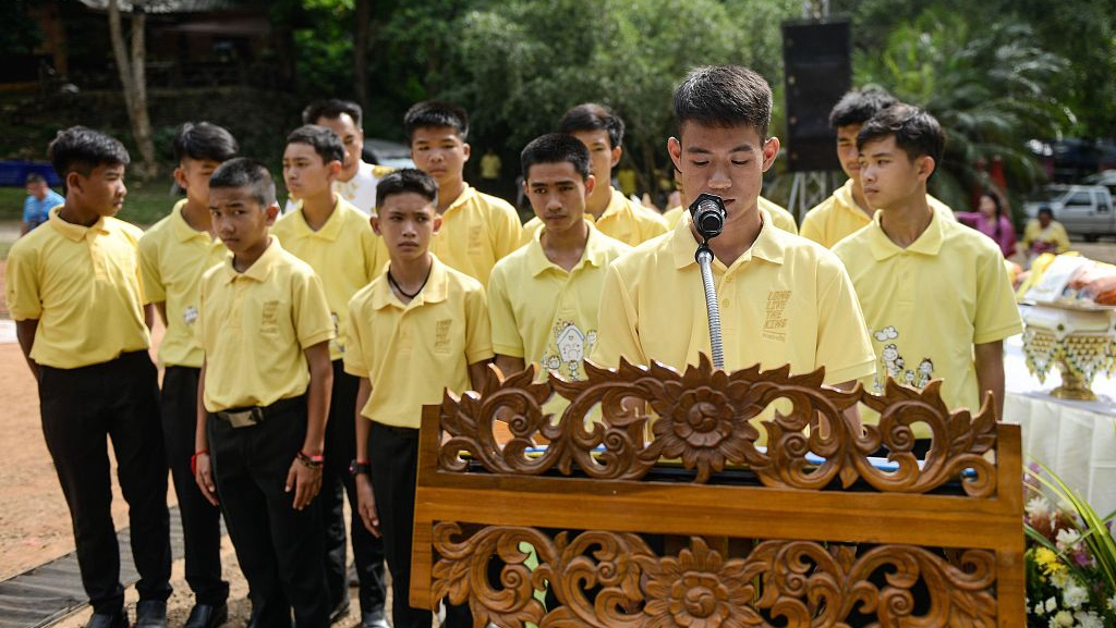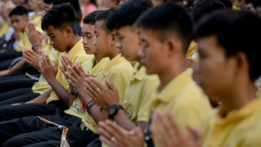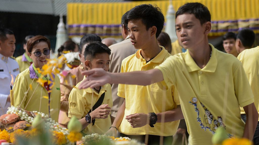 Twelve members of the Wild Boars soccer team and their coach on Monday returned to northern Thailand's Tham Luang cave where they were trapped for more than two weeks to attend a religious ceremony in honor of a Navy Seal diver killed in the rescue effort. /VCG Photo