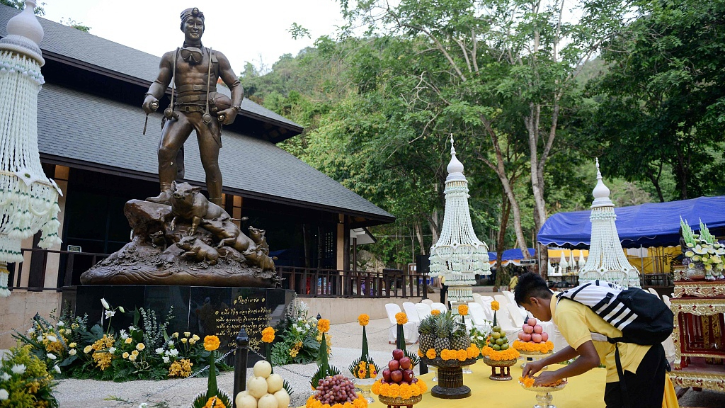 During the Buddhist ceremony, the boys and their coach placed flowers and prayed in front of a statue erected for the Navy Seal diver Saman Gunan. /VCG Photo