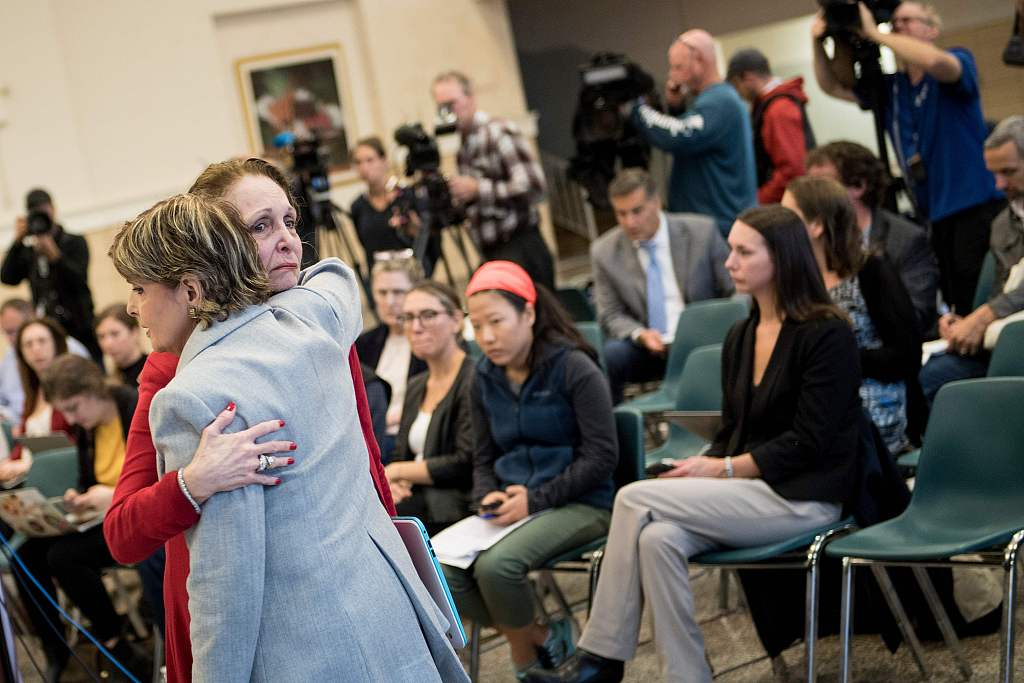 Cosby accuser Sunni Welles hugs lawyer Gloria Allred (L) following a press conference with other victims and accusers after comedian Bill Cosby was sentenced for sexual assault in Norristown, Pennsylvania, September 25, 2018. /VCG Photo