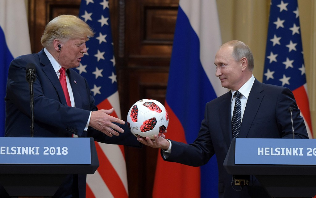Russian President Vladimir Putin (R) gives U.S. President Donald Trump a soccer ball during their joint press conference in Helsinki, Finland, July 16, 2017. /VCG Photo
