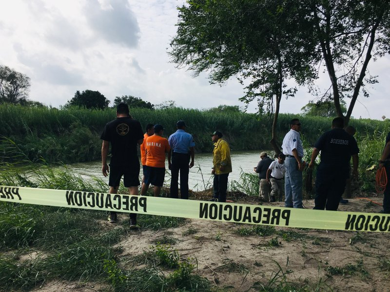 Authorities stand behind yellow warning tape along the Rio Grande bank where the bodies of two Salvadoran migrants were found, in Matamoros, Mexico,June 24, 2019. /AP Photo