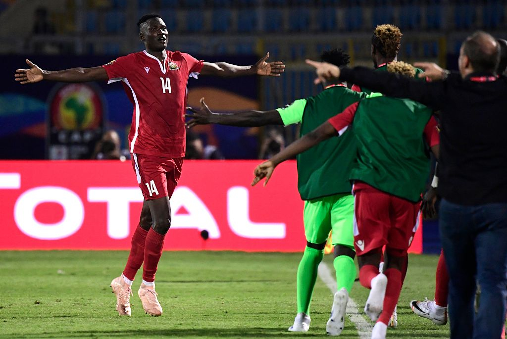 Michael Olunga (#14) celebrates after equalizing for Kenya against Tanzania. /VCG Photo