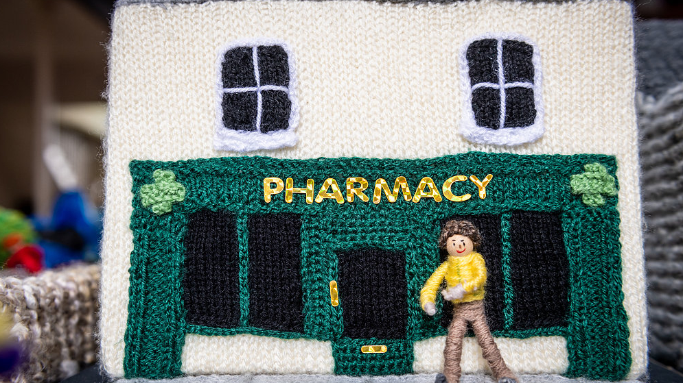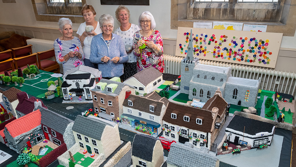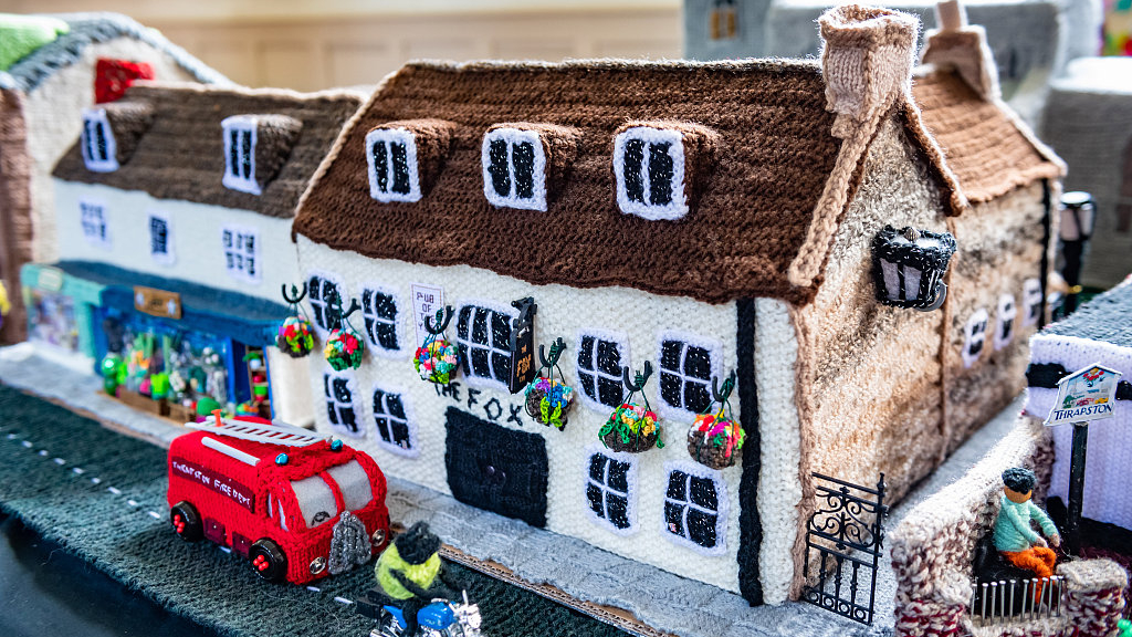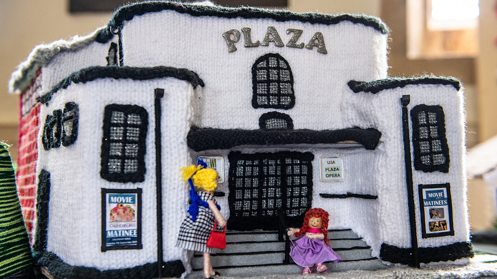 A group of senior British knitting enthusiasts have created a miniature woolen version of their hometown – including the local pub, post office, church and even their 90-year-old single screen cinema "The Plaza." /VCG Photo