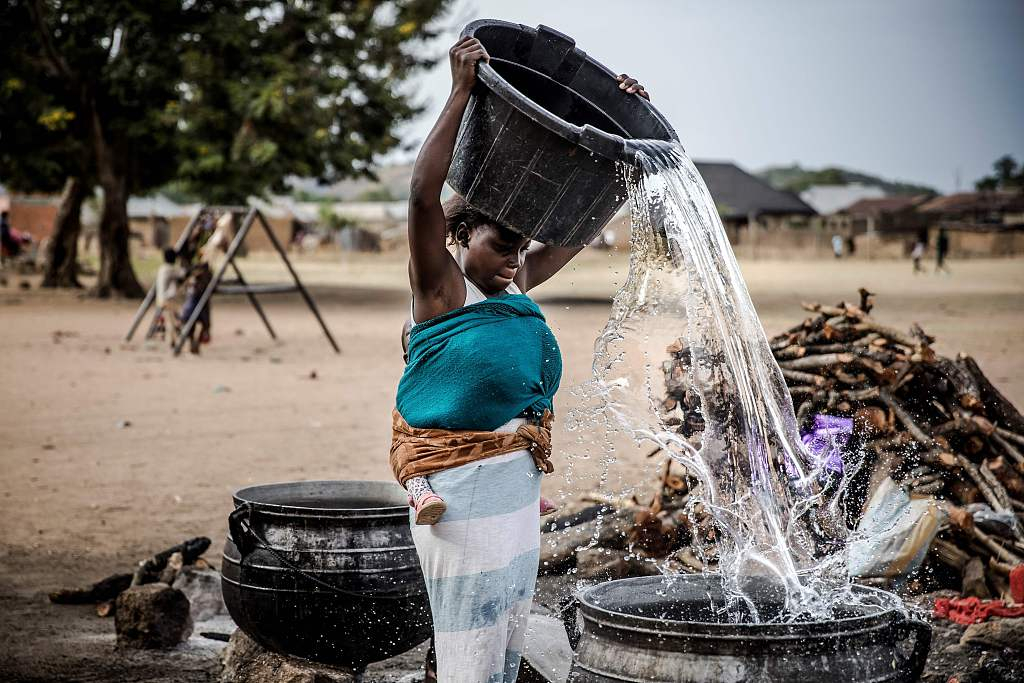 A displaced Adara woman pours water on a pot before cooking for a group of Adara displaced people at an IDPs refugee camp in Kajuru, Kaduna State, Nigeria, April 14, 2019. /VCG Photo