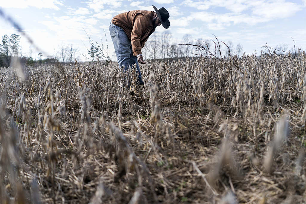 American farmer John Boyd checks the condition of his soybean field in Baskerville, Virginia, the U.S., January 8, 2019. /VCG Photo