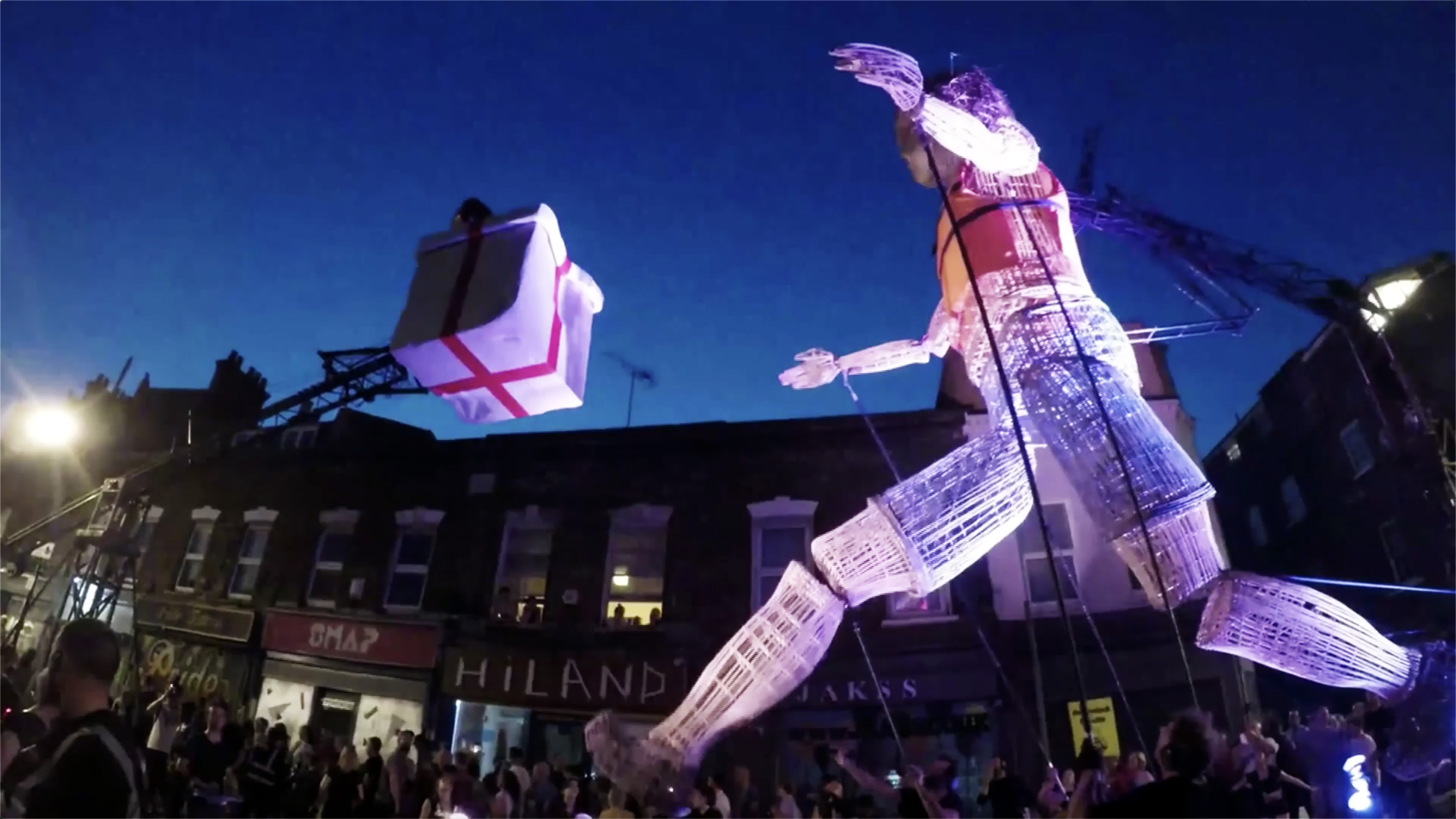 A giant puppet was seen on a street in Bow in East London on June 29. It was part of a performance for the Greenwich and Docklands International Festival. Residents were enthralled by the production of Compagnie L'Homme Debout.