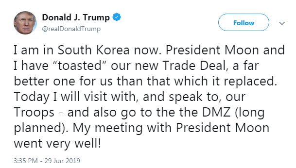 U.S. President Donald Trump tweeted on Sunday that his schedule for the day would include a speech to U.S. troops and a "long planned" visit to the Demilitarized Zone (DMZ) on the border between the Republic of Korea (ROK) and the Democratic People's Republic of Korea (DPRK).
