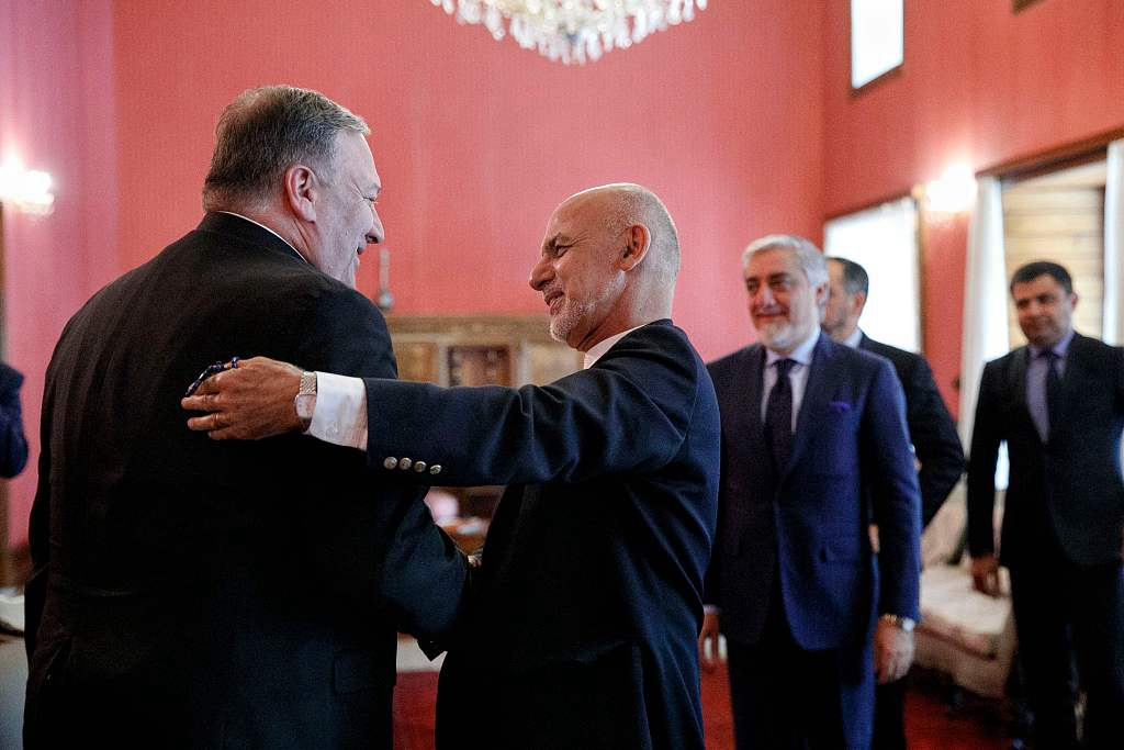 U.S. Secretary of State Mike Pompeo is greeted by Afghan President Ashraf Ghani during an unannounced visit to Afghanistan, at the Presidential Palace in Kabul, Afghanistan, June 25, 2019. /VCG Photo