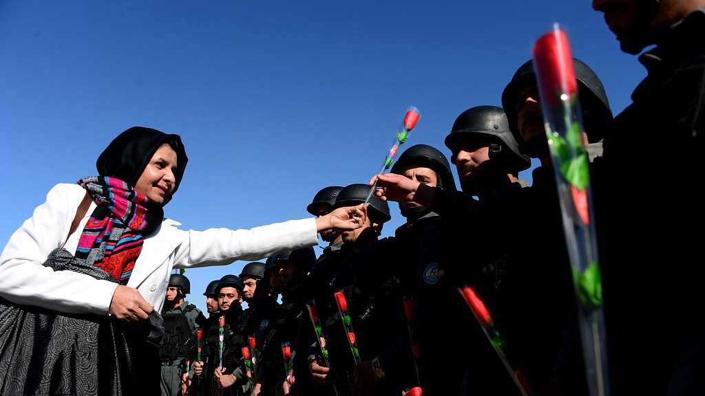 An Afghan woman hands roses to Afghan National Army (ANA) soldiers during a ceremony at the military base in Herat, northwest Afghanistan, January 13, 2015. /VCG Photo