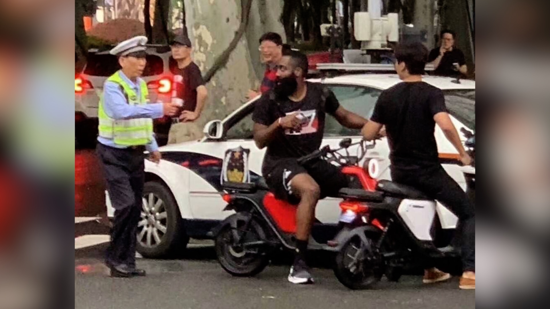 NBA superstar James Harden caused quite a commotion in Shanghai on Saturday afternoon when he rode down the street on an electric scooter with his friends, and got pulled over by traffic police for breaking local road regulations.