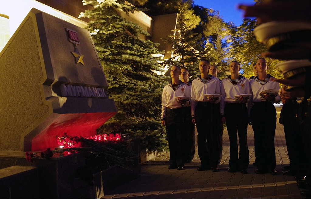 Sailors stand in formation next to the monument to the city of Murmansk as they commemorate 14 submariners who died on Monday, July 1, 2019. /VCG photo