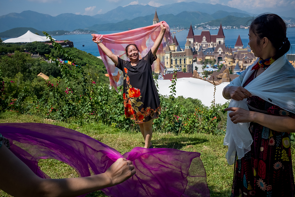 Chinese tourists pose for photos at the hill of Vinpearl Land Amusement Park in Nha Trang, Vietnam, September 8, 2017. /VCG Photo