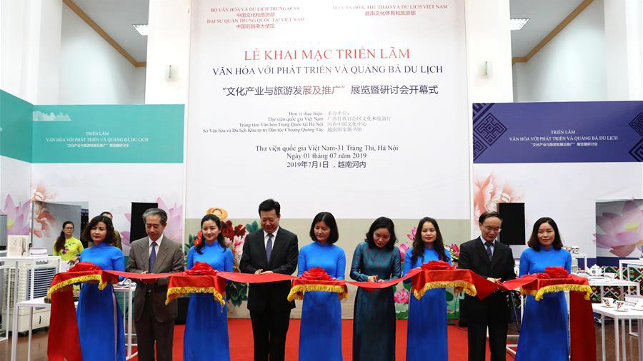 Guests cut the ribbon at the opening ceremony of an exhibition and a seminar on cultural industry and tourism promotion in Hanoi, capital of Vietnam, July 1, 2019. /Xinhua Photo