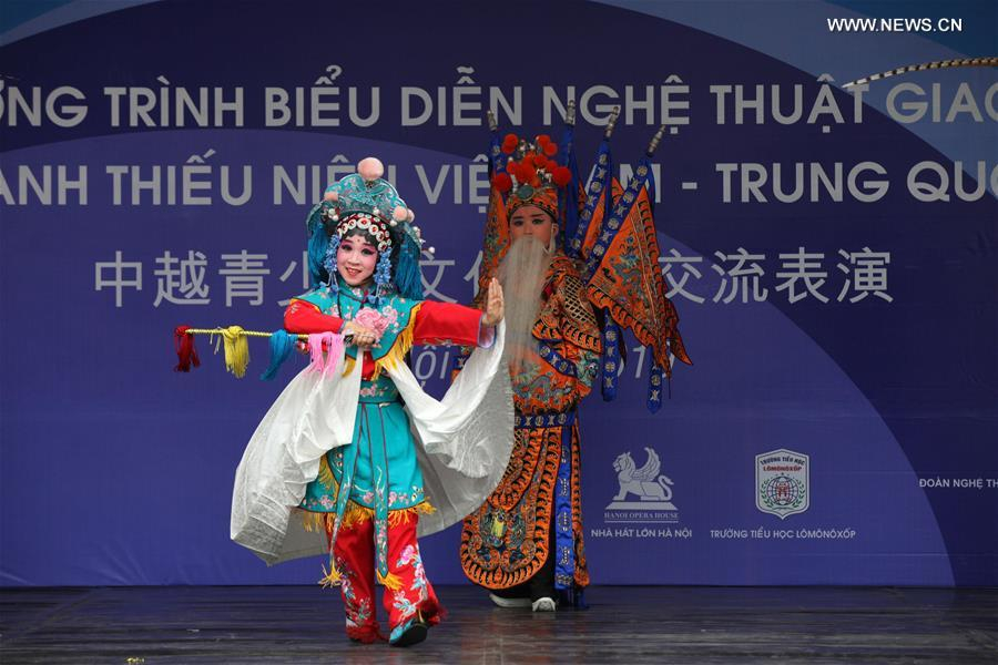 Children perform during a cultural and artistic exchange performance between Chinese and Vietnamese youngsters in Hanoi, capital of Vietnam, April 2, 2019. /Xinhua Photo