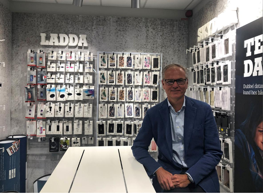 Tele2 chief executive Anders Nilsson at the brand's pocket-sized shop at its headquarters in Stockholm, Sweden, June 28, 2019. /Reuters Photo