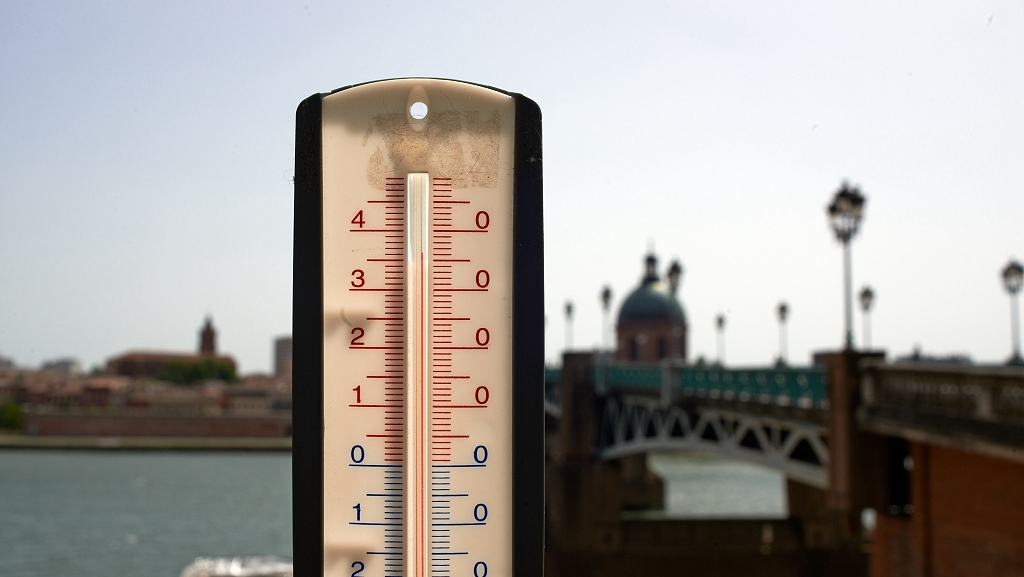 The mercury level rose to nearly 37°C mark on a thermometer by the Garonne River in Toulouse. An intense heatwave has gripped Western Europe, particularly France, June 26, 2019. /VCG Photo