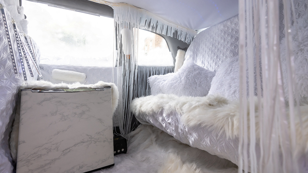 The cab's interior space was transformed into a winter wonderland, with passengers seats covered in snow white pillows and windows draped with ice decorations. /VCG Photo
