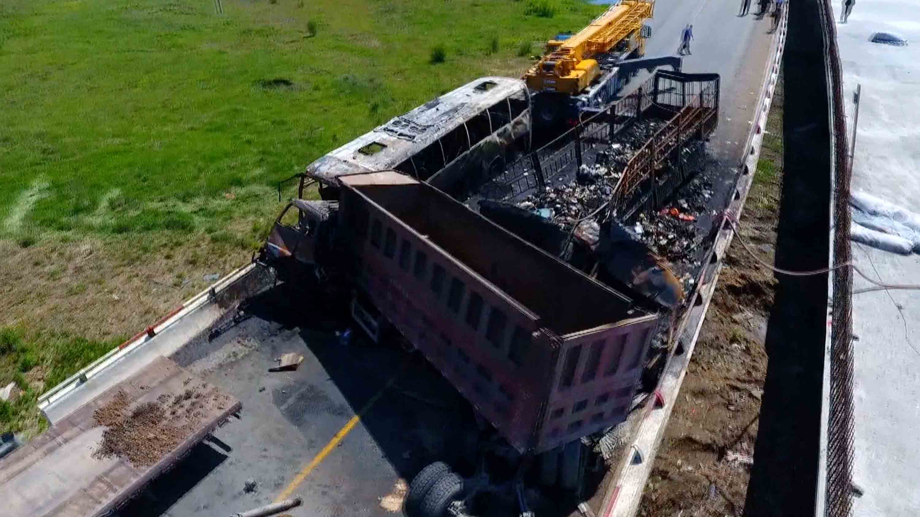 A three-vehicle collision on a bridge killed six people and injured 38. A semi-trailer crossed the yellow centerline to try to cut a passenger bus off but collided head on with an incoming dump truck and then with the bus itself . The vehicles caught fire after the collision in which the semi-trailer's driver, two bus drivers and three tourists aboard were killed instantly.