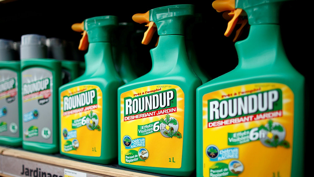 Monsanto's Roundup weedkiller atomizers on the shelf of a garden shop at Bonneuil-Sur-Marne near Paris, France, June 16, 2015. /VCG Photo