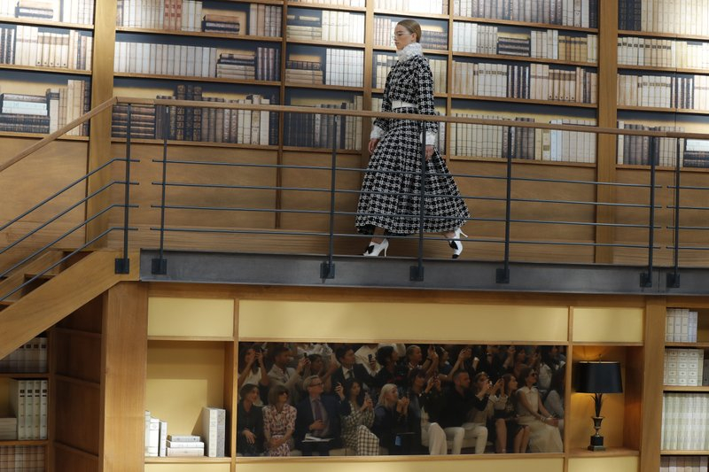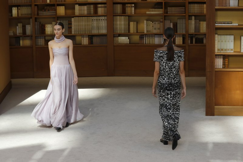 Chanel’s new chief Virginie Viard merged the worlds of two of its most famous couturiers, those of Gabrielle “Coco” Chanel and Karl Lagerfeld, for a cerebral couture show in Paris set inside a huge circular library.