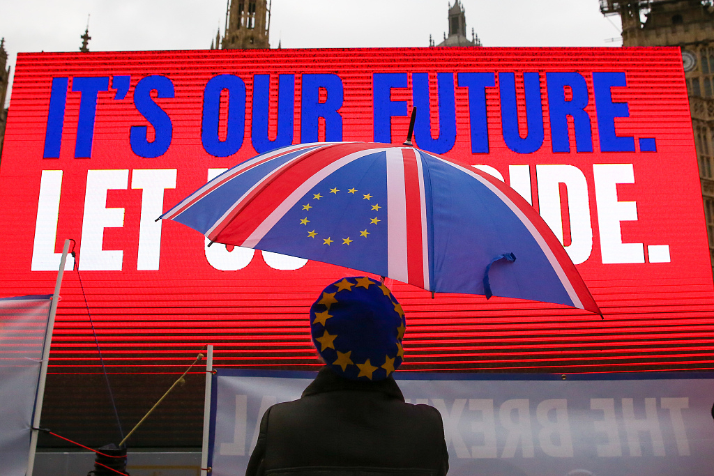 An Anti-Brexit protester is seen holding an umbrella while standing before a truck with a banner during the protest in London, January 15, 2019. /VCG Photo