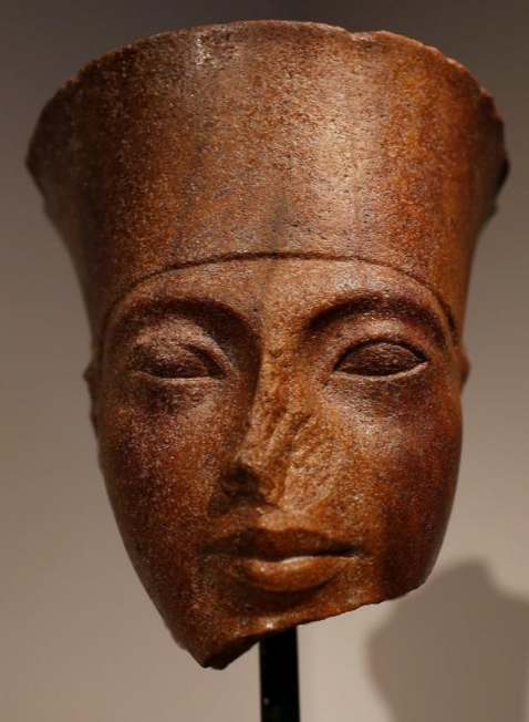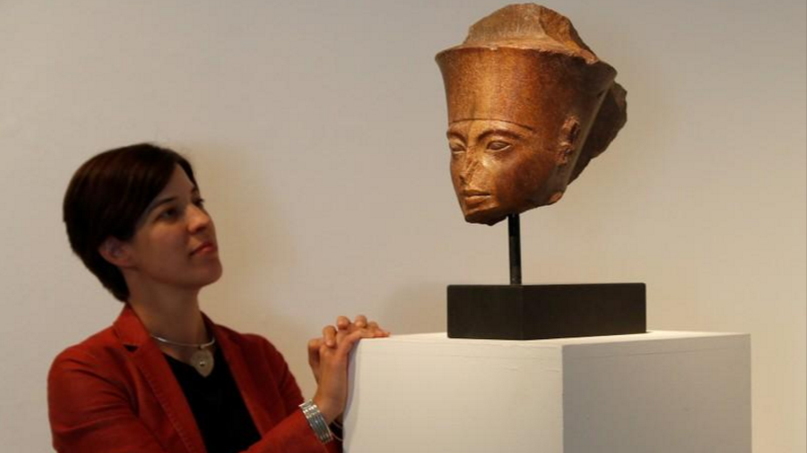 An Egyptian brown quartzite head of the God Amen is seen at Christie's auction house prior to its sale in London, July 4, 2019. /Reuters Photo